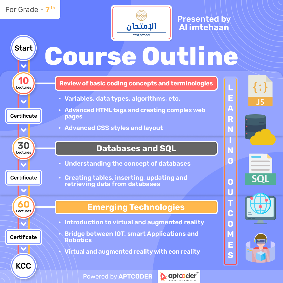 A live interactive course for learning advanced HTML tags and creating complex web pages. Introduction to JavaScript programming language. Introduction to jQuery and its use in web development. Building web applications with JavaScript frameworks (e.g. React, Angular, Vue). Creating complex queries and joining tables. Advanced programming concepts in Python (e.g. functions, lists, dictionaries). Developing games for mobile devices. Understandeing robotics and physical computing. Understanding Internet of Things (IoT) and its applications. Ethical considerations in technology. Introduction to computer graphics and design. Introduction to video production and editing. Creating simple VR and AR experiences using eon reality. Understanding the basics of cloud computing and storage.