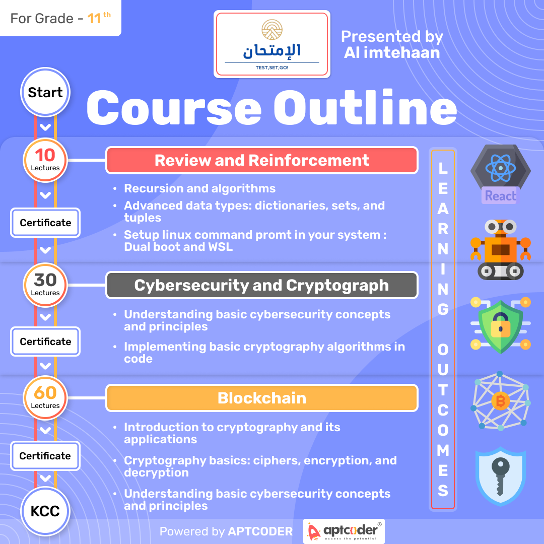 An advance course to setup linux command promt in your system : Dual boot and WSL. Learn file I/O operations in Python, Exception handling, Recursion and algorithms. Debugging strategies and tools. Algorithm complexity analysis and Big O notation. Sorting algorithm, HTML5 and its semantic elements. Handling events in React components, API integration. Functional programming, Regular Expressions in Python. NumPy library, Pandas library, Scikit-learn, Keras library, NLP-Natural Language Processing. Web Scrapping soup library. Build a recommender system using python. Creating chatbot in python. Smart Contracts, Blockchain platforms. Plblic key encryption, RSA and Diffie-Hellman. Hash functions and crytography protocols.